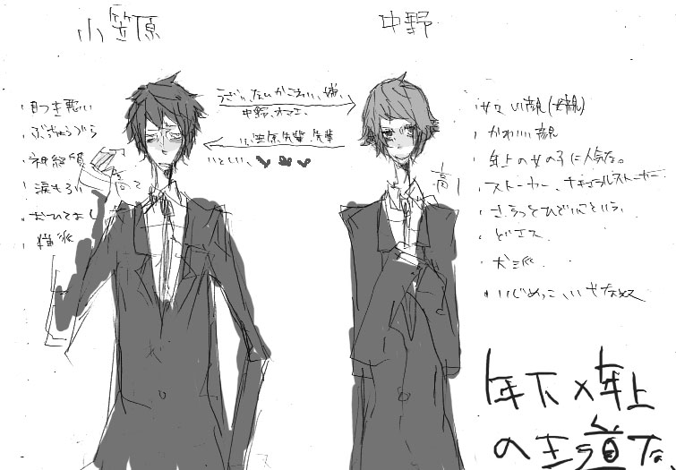 しかしどこかにはいかなくては行けない、今日は図書館に行ってこようかな。 誰か誰がどれでなにが、で、きっと私には語るべき事などないのだな、と常々思う。無駄な言葉が好きだ、無駄だって言って切り捨ててしまう大人にいつかなってしまうのだろうなと感づきつつも垂れ流す事をやめたくない、まだ子供、でも、もう今年で19だって気づくべきだ。やんなるねえ、 学生もの小説がとんでもなく進まない、序章は面倒すぎてしかたない、自分の書きたいことだけ書きたいなあと思う。だから長編は嫌なんだ。 さて新しい朝を頑張りましょうか、 動乱の一日?朝起き会というか、実践倫理うんちゃら大会東北支部とかいう仰々しくてすさまじい会でした。どこからそんなに・・ってくらいの人にあふれていました。若い子ちらほら。女性はパステルカラーのスーツで、遠くからみるとラムネ菓子みたいなかんじ。男性はダークスーツ、固まってすわっていたので葬式みたいでした。 ネタを考えたよ!半ば私信なんですが、そんな君に書いてほしいネタを考えたよ!という、どんだけ実直にホモに飢えているんだわたくしは。ちょっと自分で退いたぞ。 どうせなら好きなものがいいなあ、と年下×年上、高校一年×高校二年、中野くん×小笠原先輩。とても王道です、展開が分かりやすい類の王道です。 中野くんは普通に嫌な奴、いじめっこ気質、悪気込み込みで酷いことを言う、愛あるストーカーというか愛は免罪符だよと信じてもいない嘘をはべる、さわやかにストーキングする。顔は可愛い感じ、顔だけ見たら後輩に欲しい感じ、ただ性格が悪い、原子崩壊している。猫が嫌いだから犬派。 小笠原先輩はお人好し、なんだかんだで面倒見のいい人、人情映画で泣いて恋愛映画じゃ泣かない人。あととても神経質というか神経が細いというか苛々している。目つきが悪い、かたぎじゃない目つき。大抵不機嫌そうな顔をしている、そして大抵は不機嫌。犬に噛まれた事があるから猫派。 中野くん→→→→→→(ry 小笠原先輩、って感じ、相思相愛とかなあにそれ、な一車線一方通行。 中野くんは先輩がとても好きで(好きな理由は色々と適当に考えてくだry)、先輩は中野くんが苦手で嫌いで嫌。 だいたいそんなかんじ。設定だけなら楽しいんだよねえ、 |